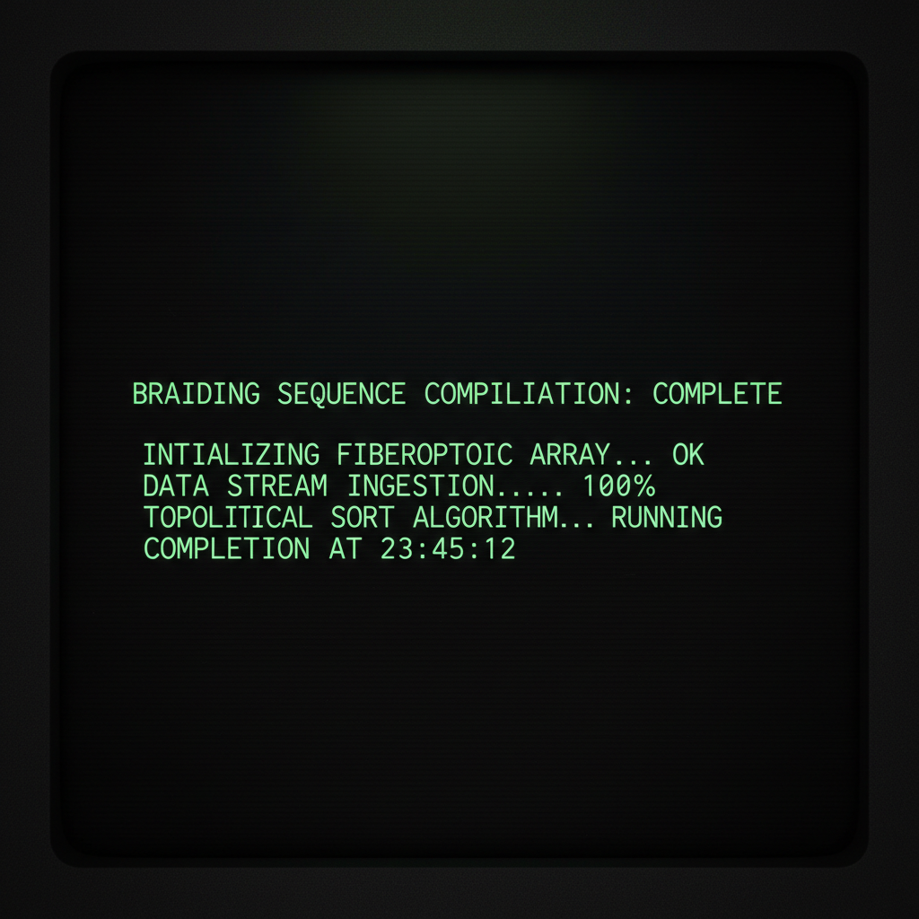 ![full screen view of monochrome green phosphor CRT terminal display, command line interface filling entire frame, heavy scanlines across black background, authentic 1970s computer terminal readout, VT100 style, green text on black, phosphor glow, screen curvature at edges, "BRAIDING SEQUENCE COMPILATION: COMPLETE" in crisp, monospace green text, centered on a pitch-black terminal screen, faint afterglow trailing each character, ambient glow barely illuminating the edges of the display frame, silence and precision in the atmosphere [Nano Banana] full screen view of monochrome green phosphor CRT terminal display, command line interface filling entire frame, heavy scanlines across black background, authentic 1970s computer terminal readout, VT100 style, green text on black, phosphor glow, screen curvature at edges, "BRAIDING SEQUENCE COMPILATION: COMPLETE" in crisp, monospace green text, centered on a pitch-black terminal screen, faint afterglow trailing each character, ambient glow barely illuminating the edges of the display frame, silence and precision in the atmosphere [Nano Banana]](https://081x4rbriqin1aej.public.blob.vercel-storage.com/viral-images/2dc13a39-8fd2-4136-a365-6236644003b2_viral_0_square.png)