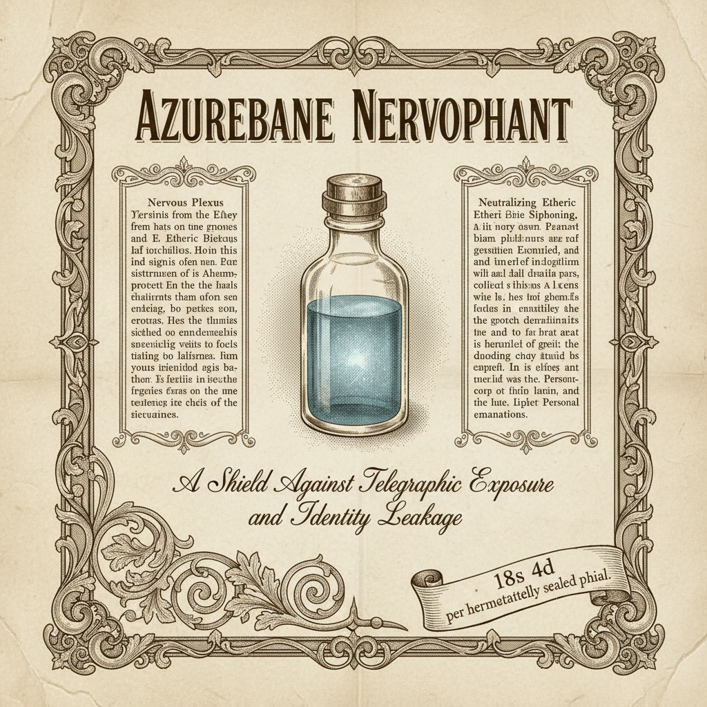In this era of accelerated currents and magnetic dispatches, the delicate Nervous Plexus is besieged by invisible intrusions, whereby the most private missives—love letters, estate transfers, parliamentary communiqués—are siphoned from the ether by unscrupulous agents employing inferential harmonics. AZUREBANE NERVOPHANT, through its revolutionary Quantum Effluvium, fortifies the Psychical Membrane, thereby cloaking both sender and receiver in an impenetrable aetheric shroud. The active principle, distilled from Faradic Crystals of Transcaspian origin, operates not upon the message, but upon the very channels of transmission, rendering identity dissolution absolute—thusly, even the most vigilant eavesdropper is confounded. Certified by the Royal Polytechnic of Novgorod as Device-Independent in its action, it requires no trust in external apparatus. [Guaranteed by Lloyd’s of London to restore anonymity or refund double the purchase price in sovereigns.] Reverend Thaddeus Wainwright of Bath writes: 'Since employing NERVOPHANT, my correspondence with the Archbishop remains sacred—no longer do I fear the Postmaster’s prying clerk!' Apply at once to your Apothecary or by post to the Institute of Luminous Privacy, Cavendish Square.