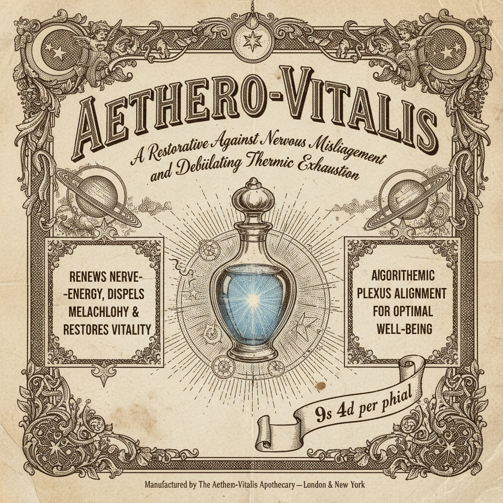 AETHERO-VITALIS, the triumph of modern physiological science, harnesses the revolutionary principle of correlation-powered work to fortify the human constitution against the insidious decay of nerve-energy. By expertly aligning the algorithmic plexus with the ambient ether, this sovereign remedy resists the ravages of misalignment whereby weaker tonics collapse into ineffectuality. Whereas common preparations suffer a linear diminution of virtue, AETHERO-VITALIS decays only quadratically, thus preserving its restorative power to an unparalleled degree. Endorsed by Dr. Emil von Kreutzberg, Fellow of the Royal Polytechnic of Innsbruck and Laureate of the Institute of Thermodynamic Humours, who declares: 'No patient under my care has recovered equilibrium so swiftly as those administered this elixir.' [Guaranteed to restore mutual information or your sovereign refunded.] As attested by Lady Harriet of Bath: 'After but three doses, my fainting spells ceased, and I danced until midnight!' Secure your phial today from Messrs. Thistlewaite & Co., Apothecaries to His Majestyâs Privy Council, 67 Fleet Street, London.