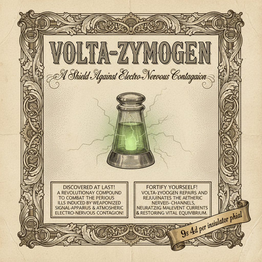 ![Victorian patent medicine advertisement, ornate decorative border with acanthus scrollwork and electric coil flourishes, bold Victorian serif typography headline reading "VOLTA-ZYMOGEN", subtitle "A Shield Against Electro-Nervous Contagion" in ornamental lowercase, central illustration of a sealed glass insulator phial with glowing green liquid and delicate electrical arcs, faint ethereal halos suggesting protective energy, aged sepia paper texture with halftone dot printing effect, two decorative text boxes with justified period type containing claims about weaponized signal-apparatus and nervous contagion, price "9s 4d per insulator phial" displayed in a curled ribbon banner in lower right, Victorian commercial design aesthetic with engraved detailing, 1890s scientific quackery style [Nano Banana] Victorian patent medicine advertisement, ornate decorative border with acanthus scrollwork and electric coil flourishes, bold Victorian serif typography headline reading "VOLTA-ZYMOGEN", subtitle "A Shield Against Electro-Nervous Contagion" in ornamental lowercase, central illustration of a sealed glass insulator phial with glowing green liquid and delicate electrical arcs, faint ethereal halos suggesting protective energy, aged sepia paper texture with halftone dot printing effect, two decorative text boxes with justified period type containing claims about weaponized signal-apparatus and nervous contagion, price "9s 4d per insulator phial" displayed in a curled ribbon banner in lower right, Victorian commercial design aesthetic with engraved detailing, 1890s scientific quackery style [Nano Banana]](https://081x4rbriqin1aej.public.blob.vercel-storage.com/viral-images/bc2ee0b7-5cf4-43c9-b717-6012401293cf_victorian_ad_nano-banana_square.png)