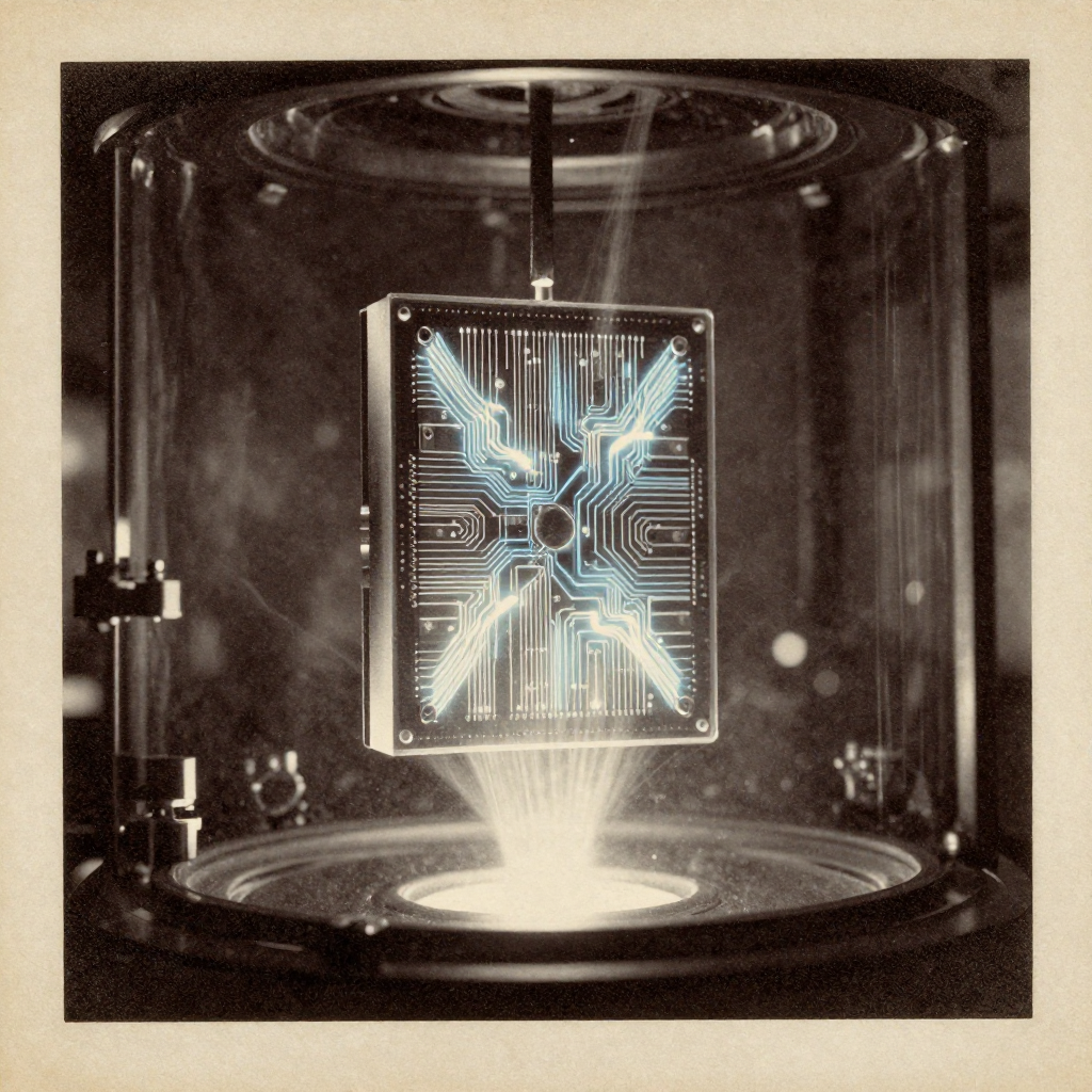 vintage Victorian newspaper photograph, sepia tone, aged paper texture, halftone dot printing, 1890s photojournalism, slight grain, archival quality, authentic period photography, a crystalline quantum processor core suspended in vacuum, its fractal niobium circuits glowing with trapped blue-white arcs of superconducting current, illuminated by sharp lateral light from below, surrounded by faint condensation trails in a dark, cold chamber [Z-Image Turbo]