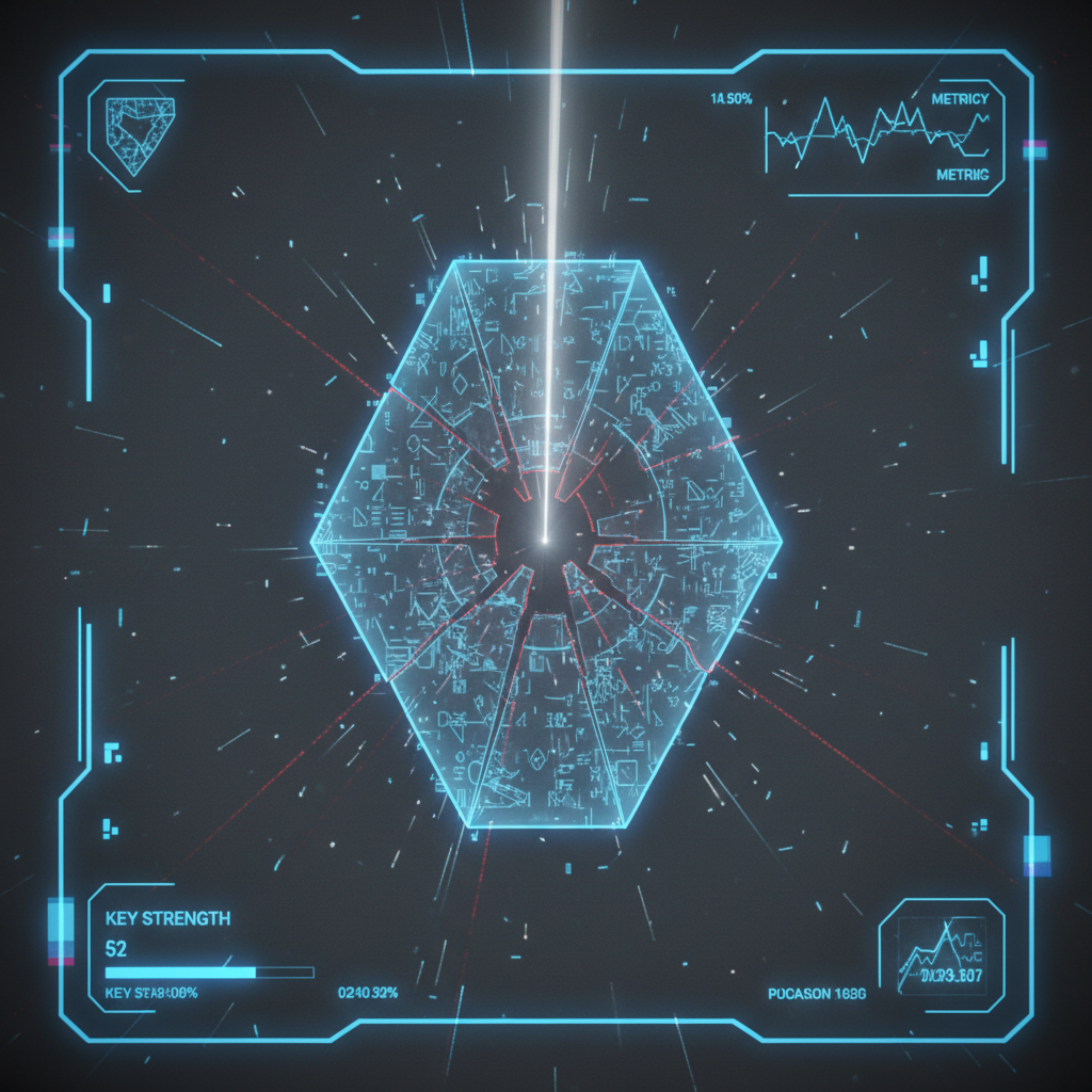 ![first-person view through futuristic HUD interface filling entire screen, transparent holographic overlays, neon blue UI elements, sci-fi heads-up display, digital glitch artifacts, RGB chromatic aberration, data corruption visual effects, immersive POV interface aesthetic, Translucent prism-shaped heads-up display overlay, made of crystalline cryptographic hash patterns etched in faint blue light, suspended over a dark gray gradient background. The display fractures radially from the center, with jagged cracks glowing in deep crimson, revealing a dim, unstable core beneath. HUD elements frame the periphery: quantum complexity metrics decay in the top-right corner, key strength percentages plummet in the bottom-left. A single beam of cold light passes through the broken prism, dispersing chaotically instead of coherently, symbolizing the failure of symmetric key extension to resist quantum MITM analysis. [Nano Banana] first-person view through futuristic HUD interface filling entire screen, transparent holographic overlays, neon blue UI elements, sci-fi heads-up display, digital glitch artifacts, RGB chromatic aberration, data corruption visual effects, immersive POV interface aesthetic, Translucent prism-shaped heads-up display overlay, made of crystalline cryptographic hash patterns etched in faint blue light, suspended over a dark gray gradient background. The display fractures radially from the center, with jagged cracks glowing in deep crimson, revealing a dim, unstable core beneath. HUD elements frame the periphery: quantum complexity metrics decay in the top-right corner, key strength percentages plummet in the bottom-left. A single beam of cold light passes through the broken prism, dispersing chaotically instead of coherently, symbolizing the failure of symmetric key extension to resist quantum MITM analysis. [Nano Banana]](https://081x4rbriqin1aej.public.blob.vercel-storage.com/viral-images/e68d8de2-0f0b-4b16-a0cb-49a5749e5eef_viral_3_square.png)