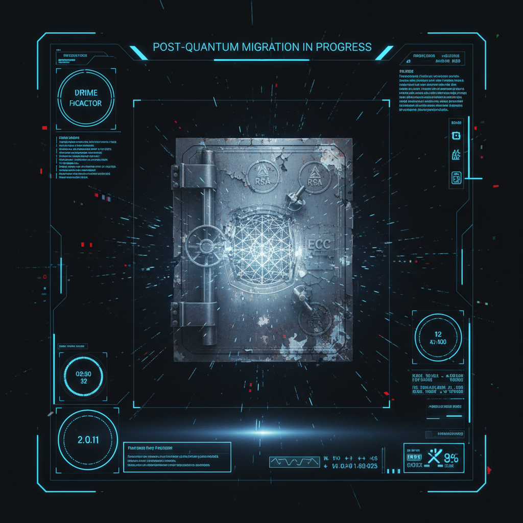 ![first-person view through futuristic HUD interface filling entire screen, transparent holographic overlays, neon blue UI elements, sci-fi heads-up display, digital glitch artifacts, RGB chromatic aberration, data corruption visual effects, immersive POV interface aesthetic, A massive, weathered digital vault door suspended in darkness, its surface etched with fading RSA and ECC insignias cracking like old paint, revealing a shimmering lattice-patterned core beneath, translucent HUD elements overlaying the edges—glowing countdown timers, rotating prime factor warnings, and a pulsing "POST-QUANTUM MIGRATION IN PROGRESS" banner—light from below casting sharp, angular shadows across the interface plane, atmosphere of quiet urgency as the old cipher skin peels away to expose the new mathematical foundation emerging within [Nano Banana] first-person view through futuristic HUD interface filling entire screen, transparent holographic overlays, neon blue UI elements, sci-fi heads-up display, digital glitch artifacts, RGB chromatic aberration, data corruption visual effects, immersive POV interface aesthetic, A massive, weathered digital vault door suspended in darkness, its surface etched with fading RSA and ECC insignias cracking like old paint, revealing a shimmering lattice-patterned core beneath, translucent HUD elements overlaying the edges—glowing countdown timers, rotating prime factor warnings, and a pulsing "POST-QUANTUM MIGRATION IN PROGRESS" banner—light from below casting sharp, angular shadows across the interface plane, atmosphere of quiet urgency as the old cipher skin peels away to expose the new mathematical foundation emerging within [Nano Banana]](https://081x4rbriqin1aej.public.blob.vercel-storage.com/viral-images/e96e7173-8cab-4f1c-bdd0-bb45def3e0cd_viral_3_square.png)